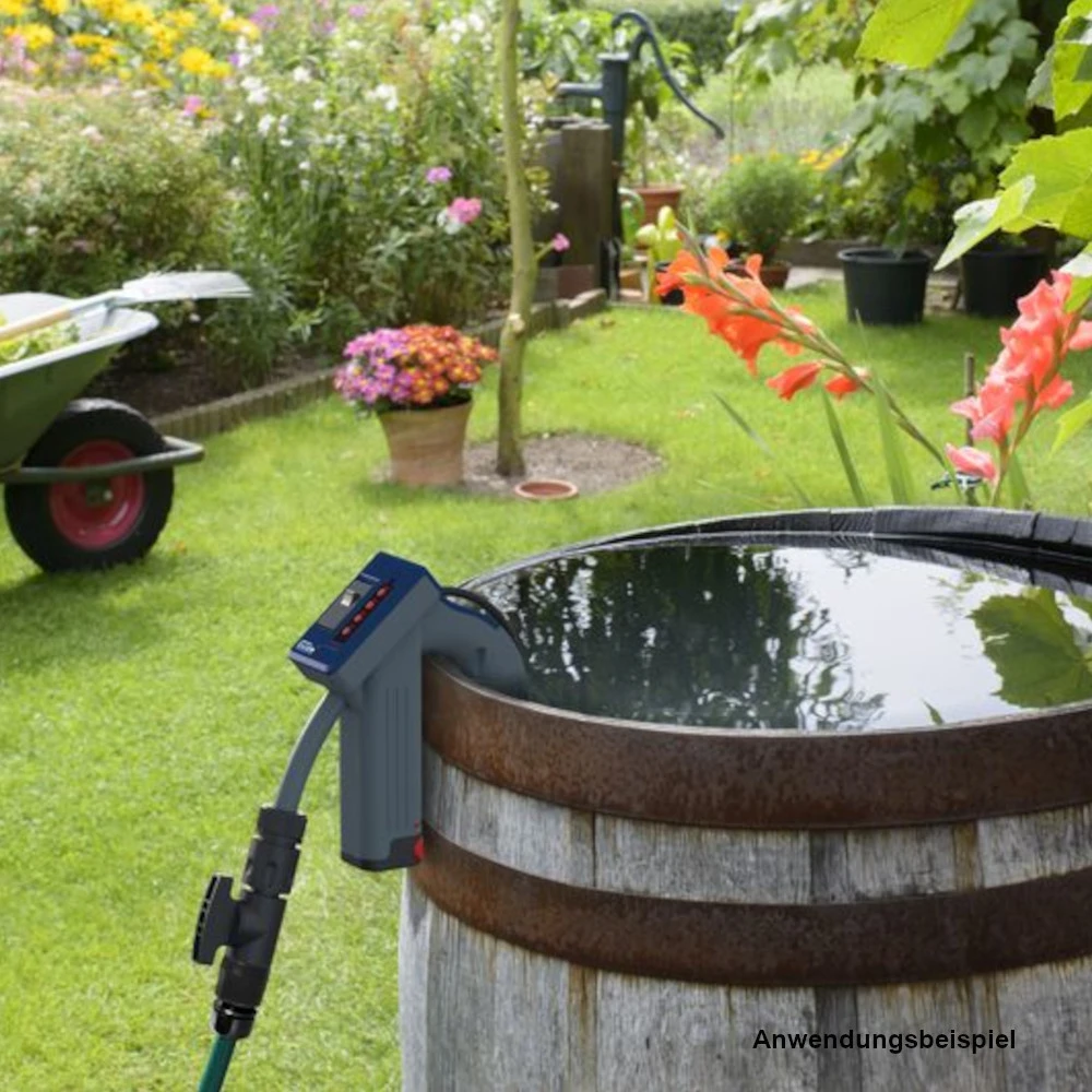 Akku-Regenfasspumpe von Güde inklusive wechselbaren Akku und Ladegerät. Die Gartenpumpe eignet sich ideal zur Gartenbewässerung aus Regenfässern und Entleeren von Pools oder Teichen.