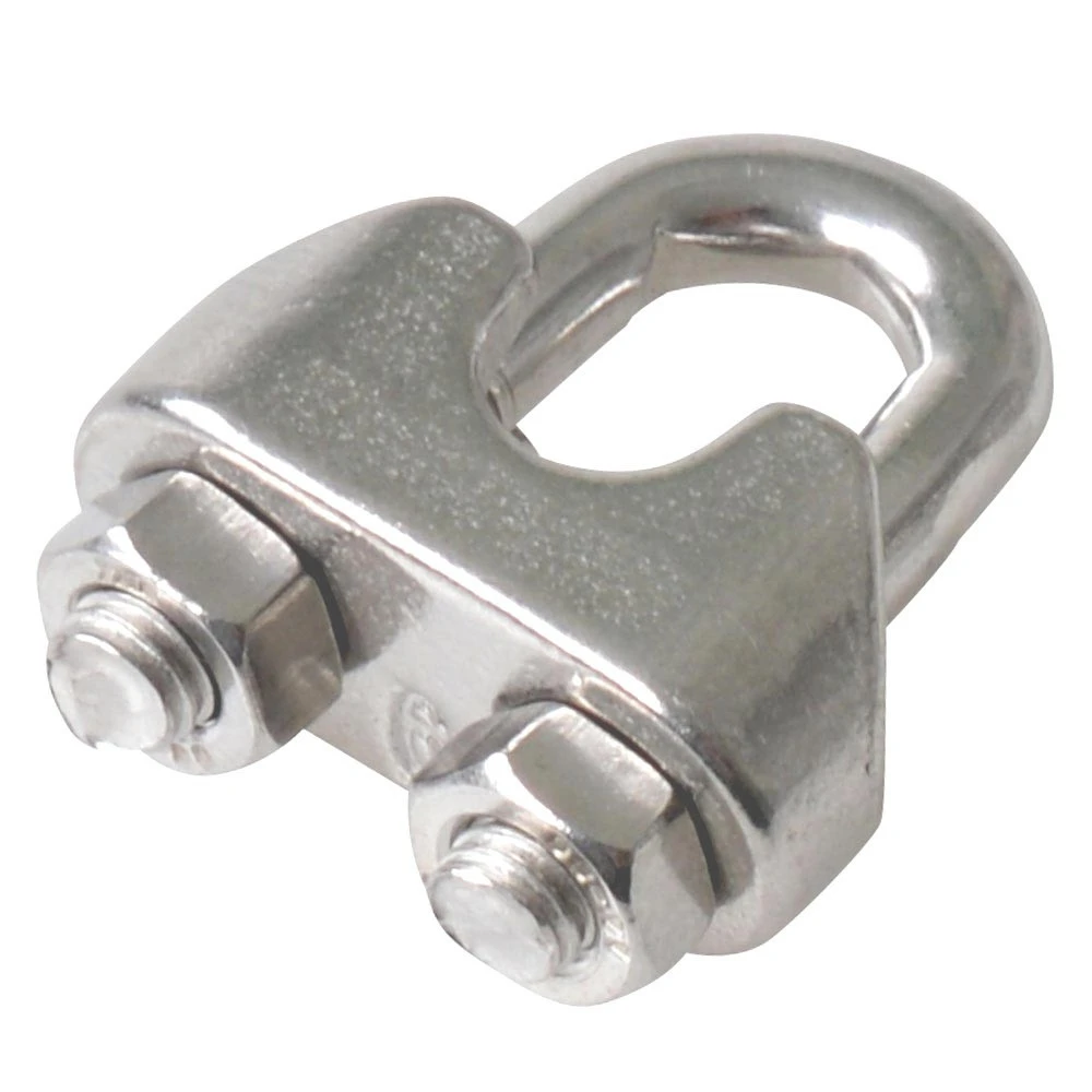 Drahtseilklemme aus Edelstahl mit metrischem Gewinde. Die Seilklemme ist geeignet fĂŒr 3 mm Drahtseile und hat ein Gewicht von ca. 18 g.