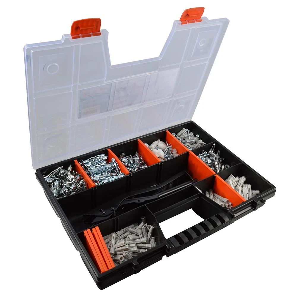 Gipskarton-Sortiment, 462-teilig, bestehend aus verschiedenen Gipskarton-DĂŒbel und Schrauben in der praktischen Kunststoff-Aufbewahrungsbox mit Klarsichtdeckel und 10 x TrennwĂ€nde (flexibel einsteckbar).