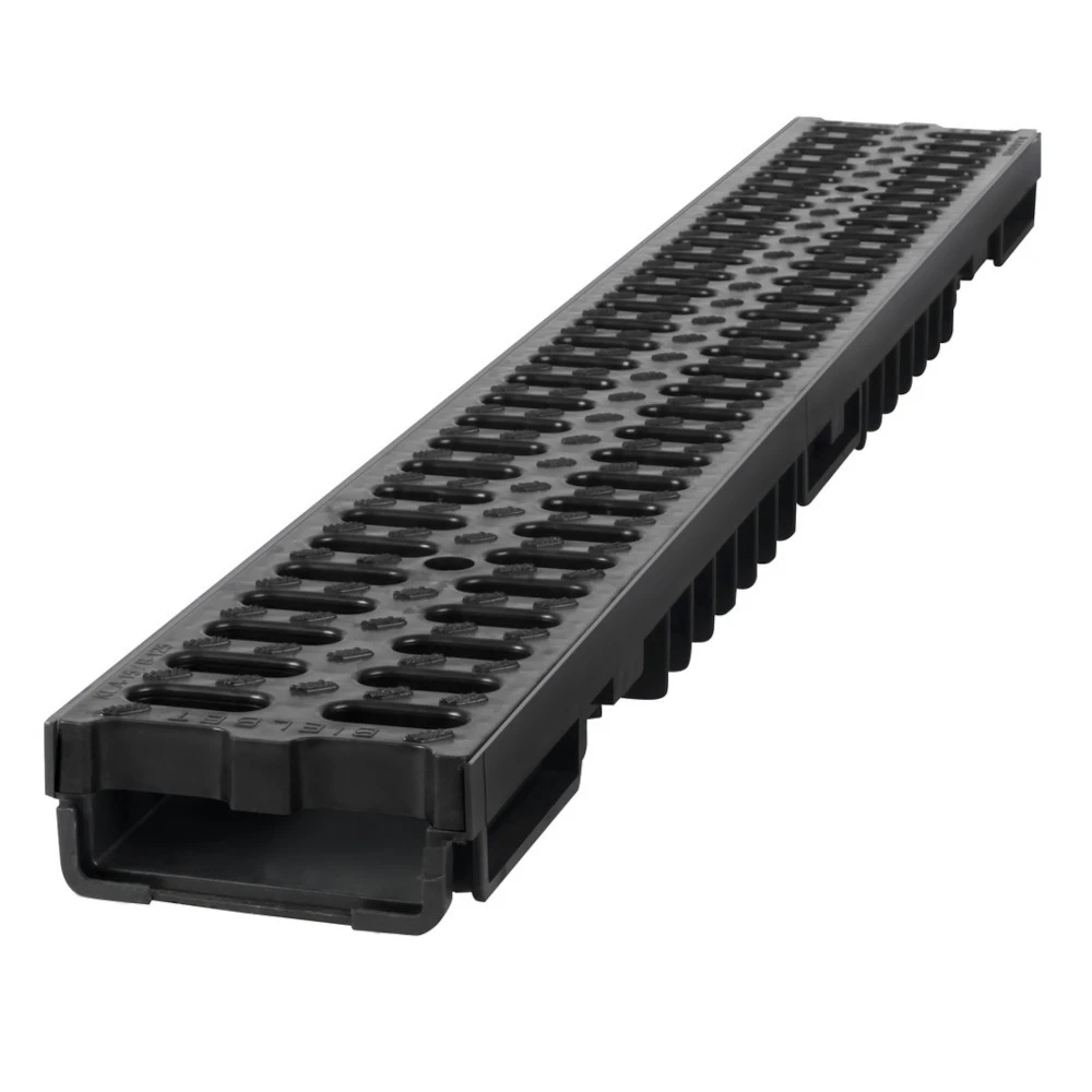 Linienentwässerung-Abflusskanal 1000×130 mm mit Abdeckrost aus PP-Kunststoff. Der Abdeckrost aus Kunststoff ist mit zwei Schrauben am Abflusskanal montiert. Der Abflusskanal hat drei Bodenabläufe und eine maximale Belastungsgrenze von 1,5 Tonnen.