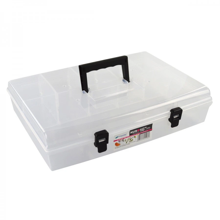 Sortimentskasten mit 6 FĂ€cher und herausnehmbaren Unterteilungen, transparent. Praktischer Tragegriff im Klappdeckel integriert, Sortimentskasten mit Klickverschluss. Ideal fĂŒr Hobby und Beruf zum Aufbewahren von Kleinteilen wie Schrauben, Kleinwerkzeug, NĂ€hzubehör usw.
