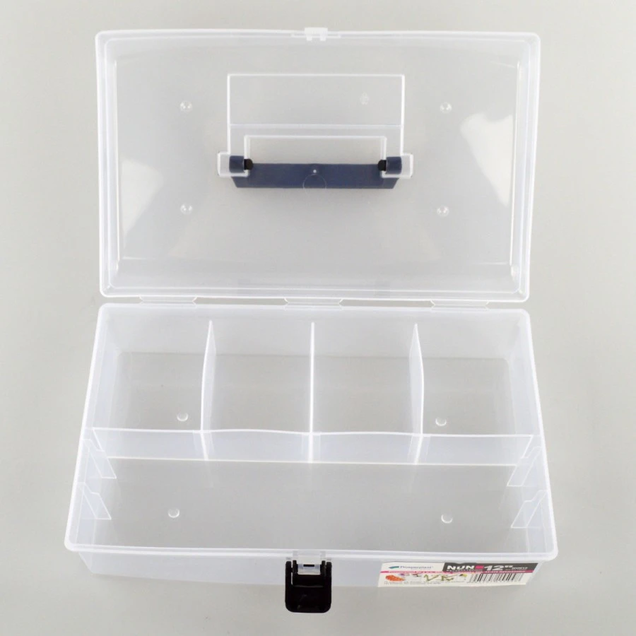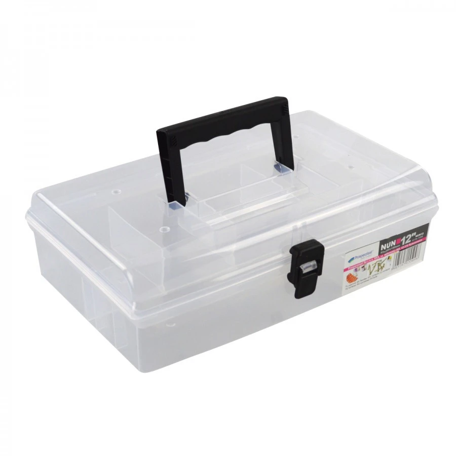 Praktischer Sortimentskasten mit 5 FĂ€chern und festen Unterteilungen. Die Kleinteilebox ist transparent und verfĂŒgt ĂŒber einen praktischen Tragegriff, welcher im Klappdeckel integriert ist.