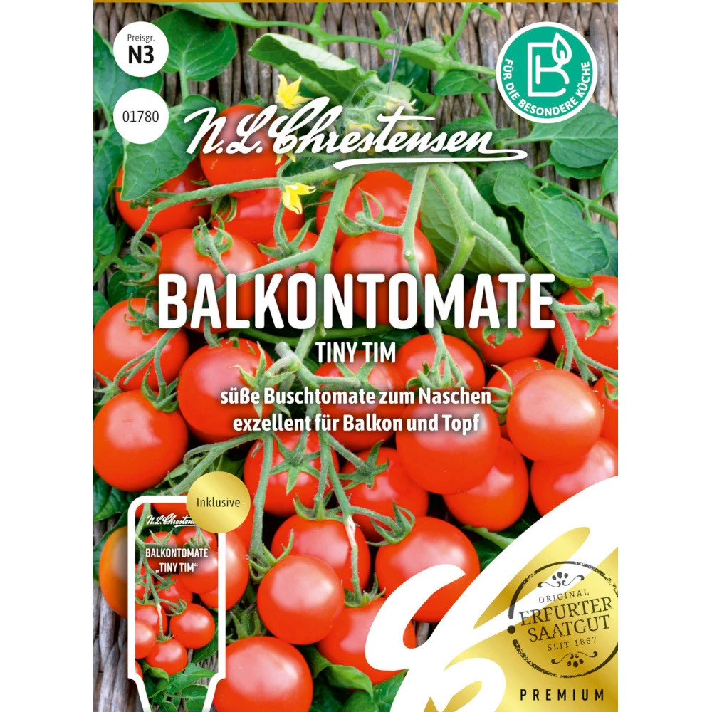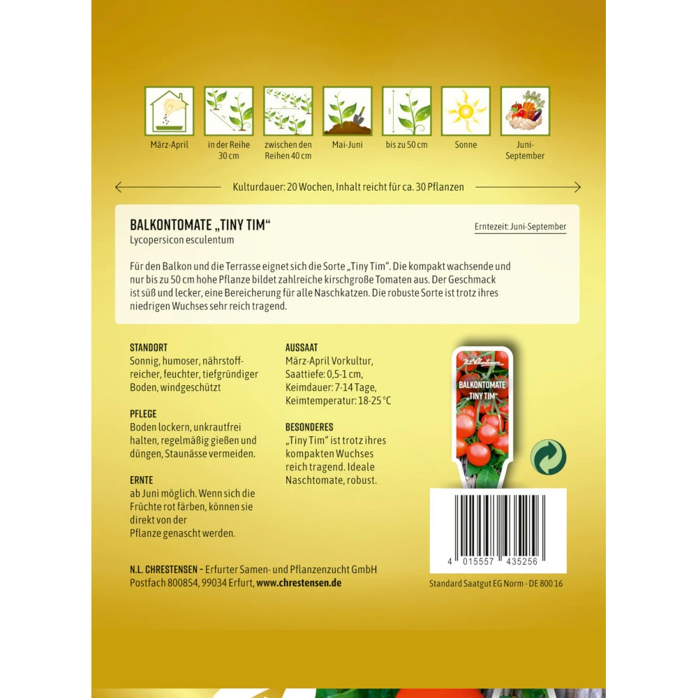 Die Balkontomate Tiny Tim ist mit ihrem kompakten Wuchs und zahlreichen, kirschgroĂen FrĂŒchten eine sehr ertragreiche Buschtomaten-Sorte. Sie wird nur ca. 50 cm hoch und lĂ€sst sich in KĂŒbeln oder KĂ€sten kultivieren. Die FrĂŒchte verfĂŒgen ĂŒber einen sĂŒĂ-leckeren Geschmack und eignen sich ideal fĂŒr alle Naschkatzen. Ein Stecketikett ist mit inklusive.