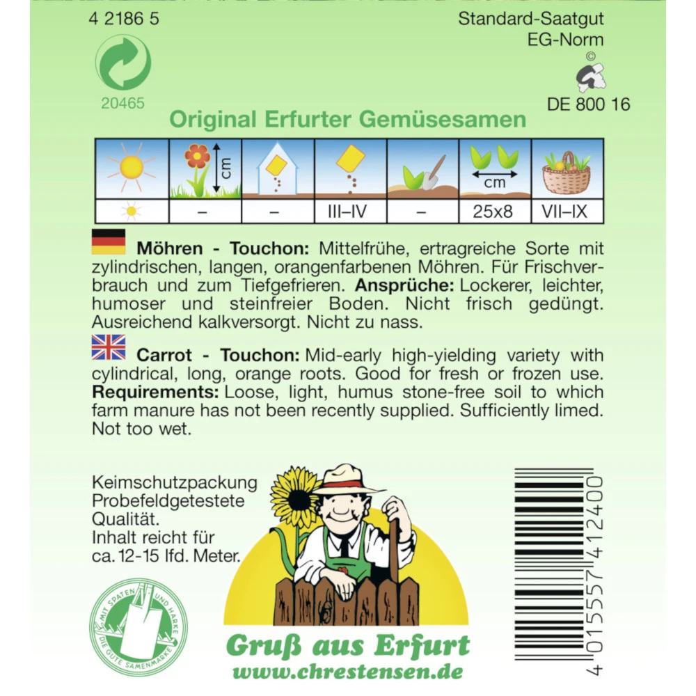 - 1 x Saatgut Speisemöhre Touchan mittelfrühe Sorte (ausreichend für ca. 12 – 15 laufende Meter)