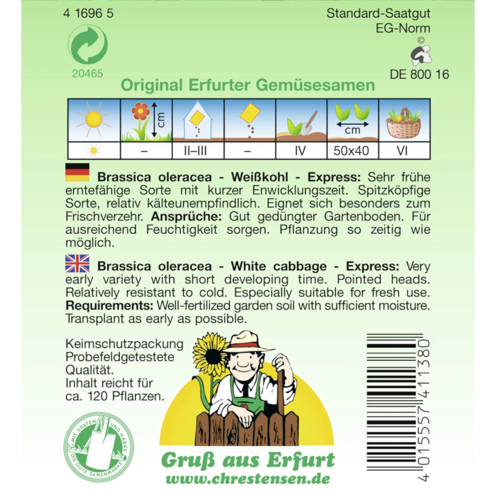 - 1 x Saatgut Weißkohl Express sehr frühe Sorte (ausreichend für ca. 120 Pflanzen)