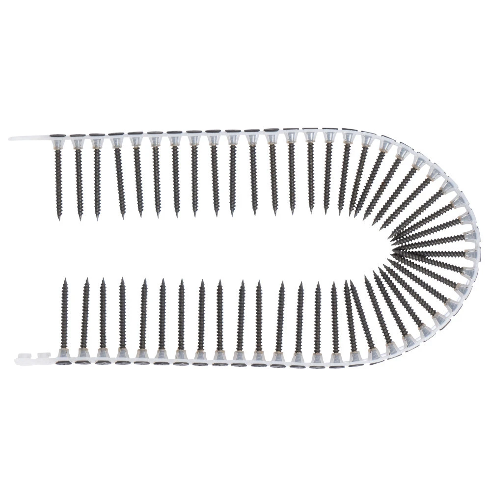 Die Schnellbauschrauben mit Kreuzschlitzantrieb eignen sich fĂŒr sĂ€mtliche Magazintrockenbauschrauber (siehe Anhang) und sind fĂŒr einen festen Halt bei der Trockenbauplatten-Bearbeitung mit einem Feingewinde versehen. Mit 50 Schrauben in jedem Band ist es möglich, bei minimalen Unterbrechungen und Standzeiten zu arbeiten. Die selbst schneidenden Schrauben werden von unten durch das Band zum Schraubendreher gefĂŒhrt, so dass nach dem Schraubvorgang immer wieder eine Schraube fĂŒr einen schnellen Arbeitsfortschritt zur VerfĂŒgung steht.