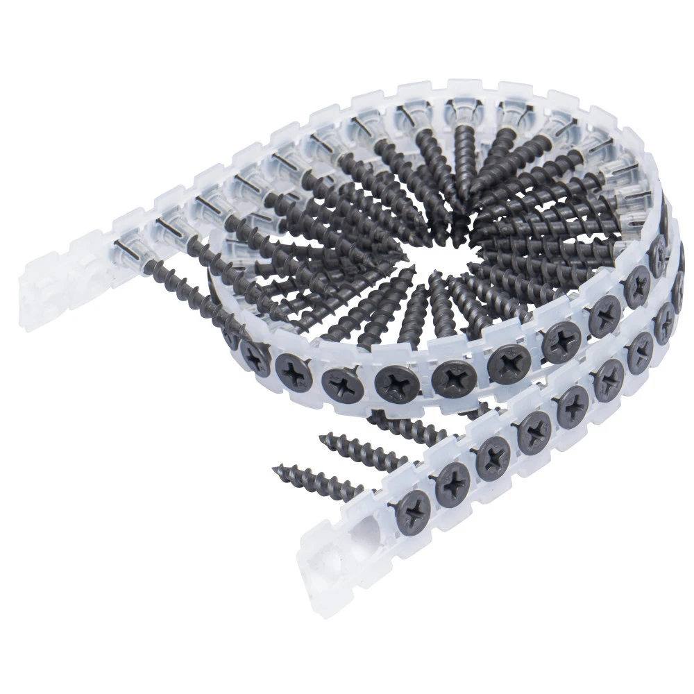 Die Schnellbauschrauben mit Kreuzschlitzantrieb eignen sich fĂŒr sĂ€mtliche Magazin-Trockenbauschrauber und sind fĂŒr einen festen Halt bei der Trockenbauplatten-Bearbeitung mit einem Grobgewinde versehen. Mit 50 Schrauben in jedem Band ist es möglich, bei minimalen Unterbrechungen und Standzeiten zu arbeiten. Die selbst schneidenden Schrauben werden von unten durch das Band zum Schraubendreher gefĂŒhrt, so dass nach dem Schraubvorgang immer wieder eine Schraube fĂŒr einen schnellen Arbeitsfortschritt zur VerfĂŒgung steht.